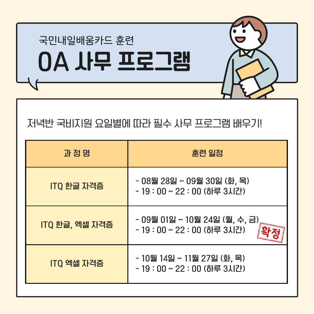 | ITQ 한글·엑셀 자격증 | 9/1 ~ 10/24 (월·수·금) | 19:00 ~ 22:00 (3시간) | 집중 트랙 |