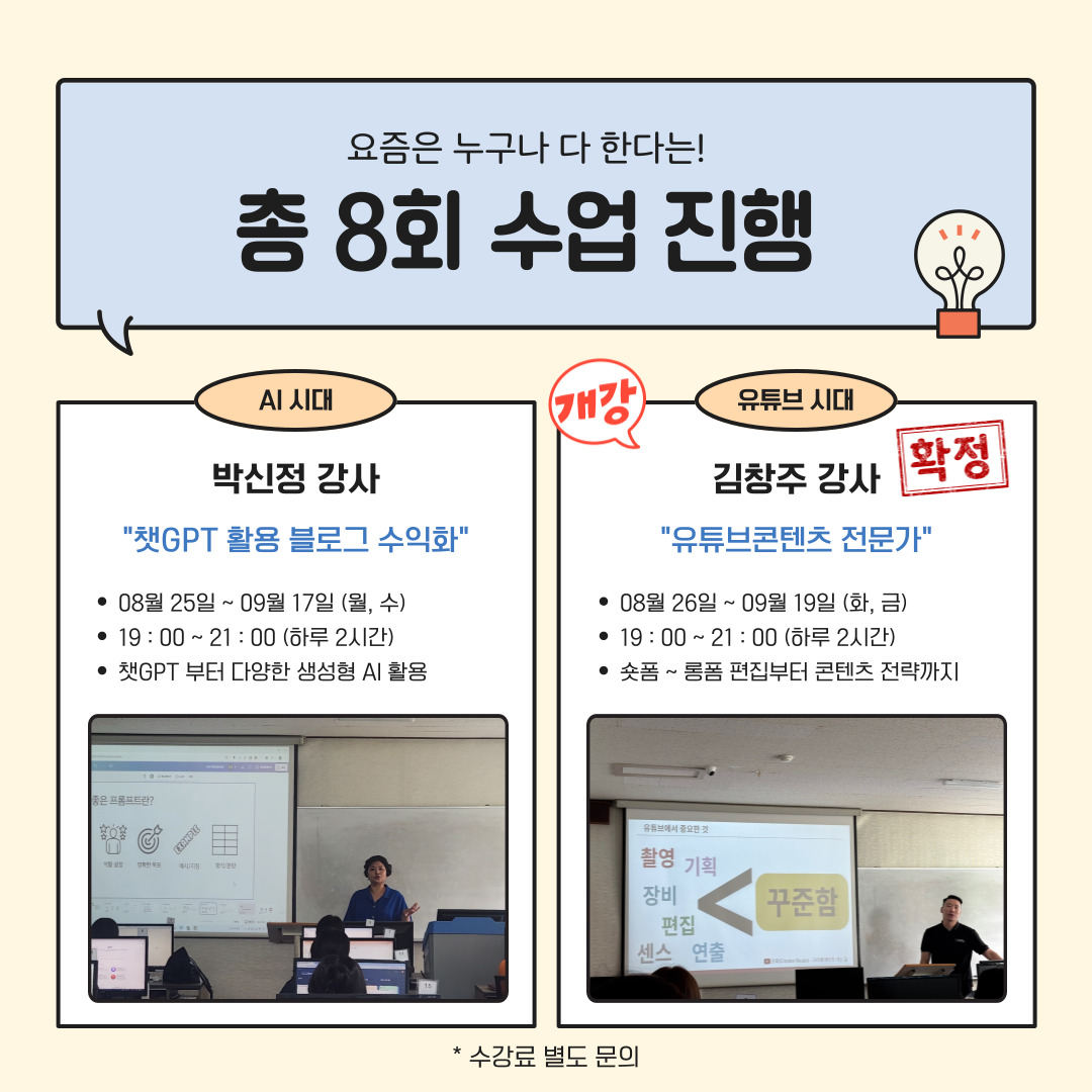 | 8/26 ~ 9/19 (화·금) | 19:00 ~ 21:00 (2시간) | 숏폼부터 전략까지 실무 |